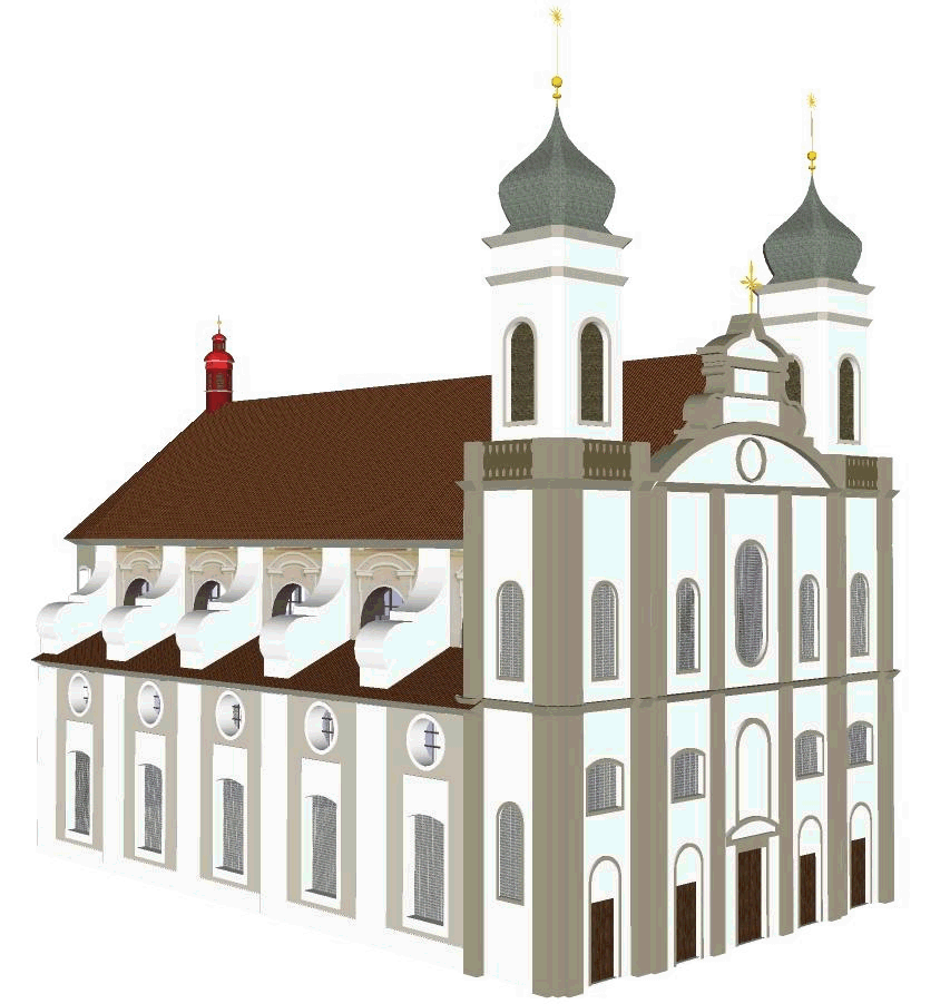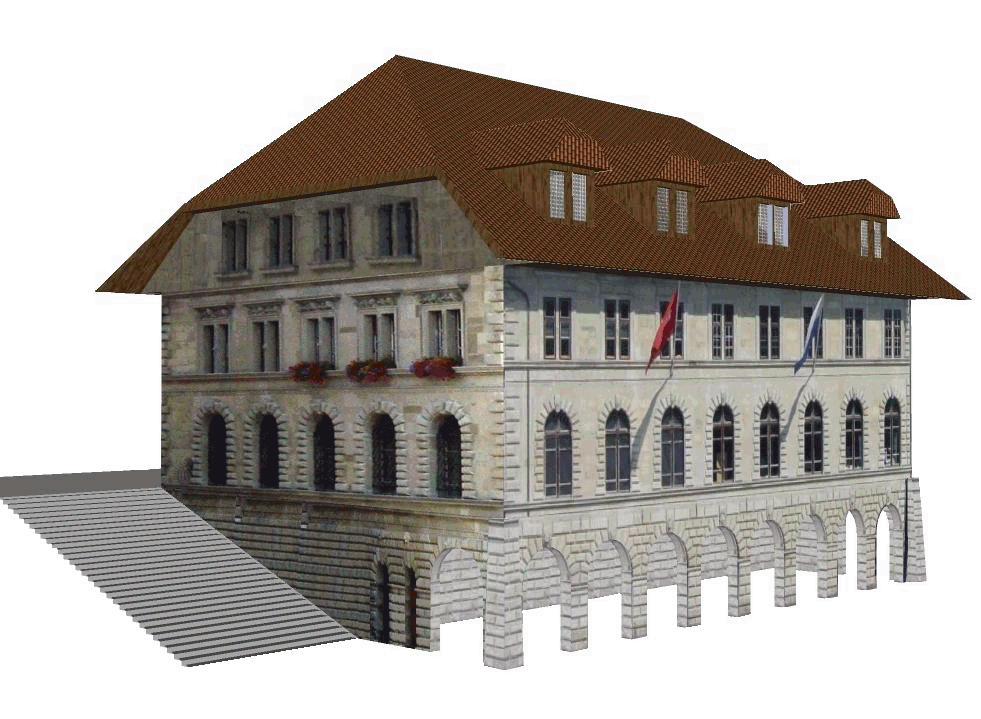 Gebäuden mit Balkonen, Terrassen, Arkaden und Türmen Dach mit Lukarnen, Kuppelnmit Texturen und Farben |